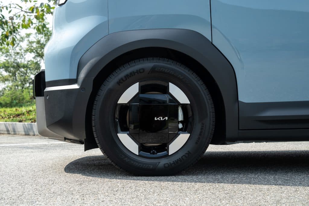 På parkeringen väntar PV5 Passenger på mig. Redan vid en första anblick blir det tydligt att Kias spektakulära design har dragits till sin spets: hård och kantig på utsidan men mjuk och välkomnande interiört.